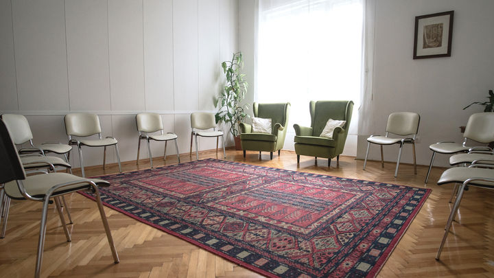 A 25 m2-es Rozmaring szobánk az egyéni ülések mellett méretével komfortos és otthonos 8-12 fős csoportok számára. A szobában rendelkezésre áll 12 ülőpárna, 14 db szék, 12 db jógamatrac, takarók.